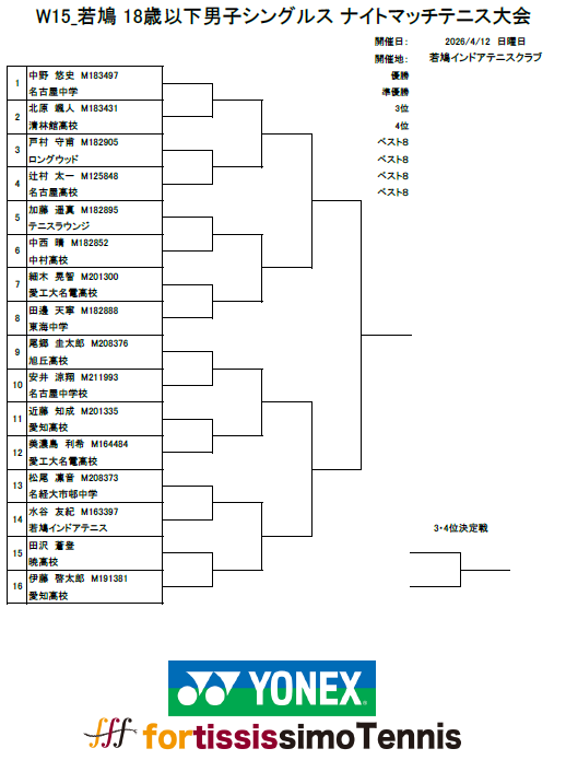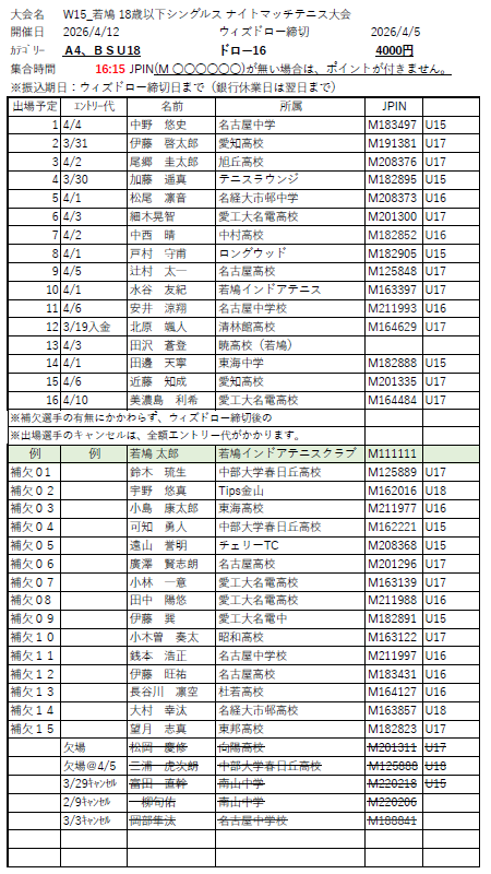 4/12(日) 18歳以下男子シングルス リスト&ドロー改定(4/10更改)