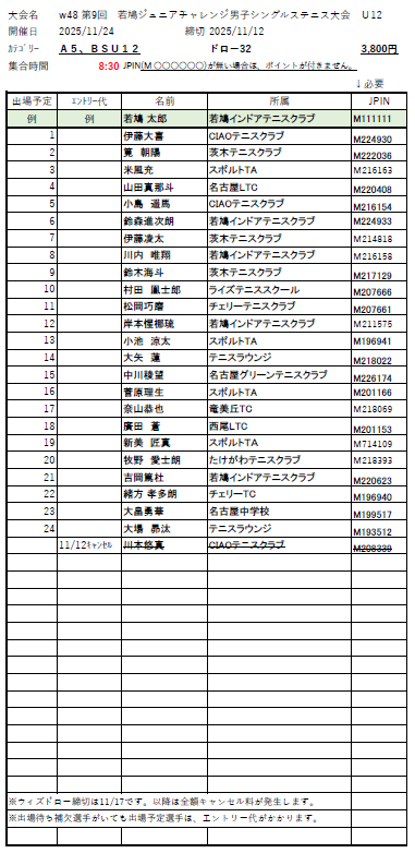 11/24(月・祝) 12歳以下男子シングルス大会 エントリーリスト発表