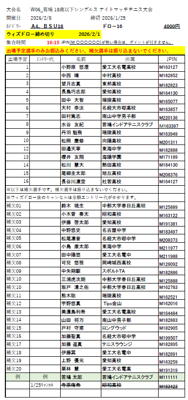 2/8(日) 18歳以下男子シングルス大会 アクセプタンスリスト発表