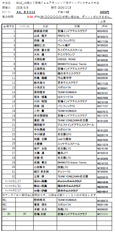 3/8(日) 13歳以下男子シングルス大会 アクセプタンスリスト発表