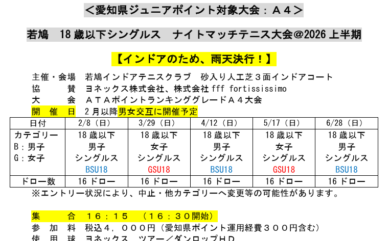 ⑦9/27(日)15歳以下男子シングルス ナイトマッチ(16ドロー) <=6/1受付開始