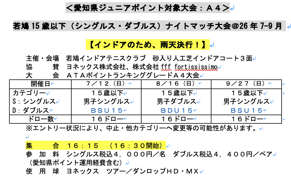 ④7/12(日)15歳以下男子シングルス ナイトマッチ(16ドロー) <=4/1受付開始