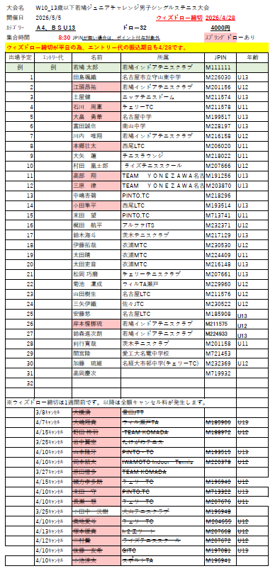 5/5(火・祝) 13歳以下男子シングルス アクセプタンスリスト公開