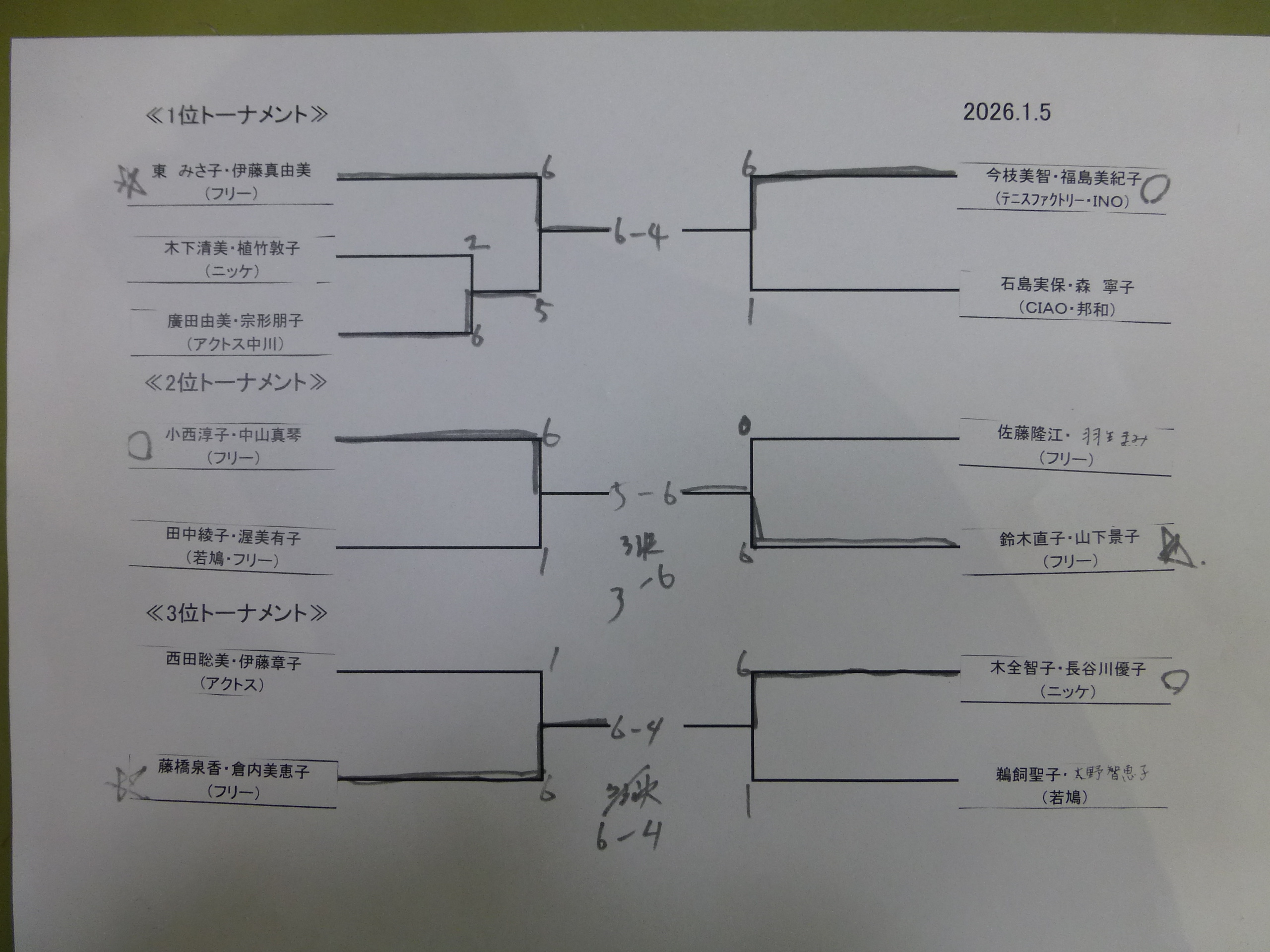 | 1位トーナメント | 準優勝 | テニスファクトリー・INO | 今枝美智・福島美紀子 |