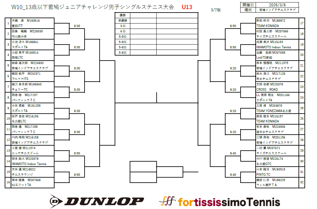 - 3月8日 【グレード:A4】13歳以下男子シングルステニス大会(BSU13、3月度)