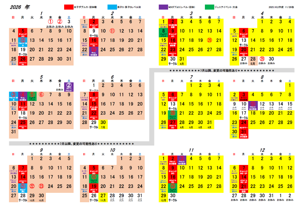 - スクール期の色の上に大会名が記載されている場合は、スクール後に開催(ナイトマッチ)、そうでない場合は、朝からの日中帯開催となります。(例:1/4 夕方〜 ナイトマッチ、1/5 朝〜大会)